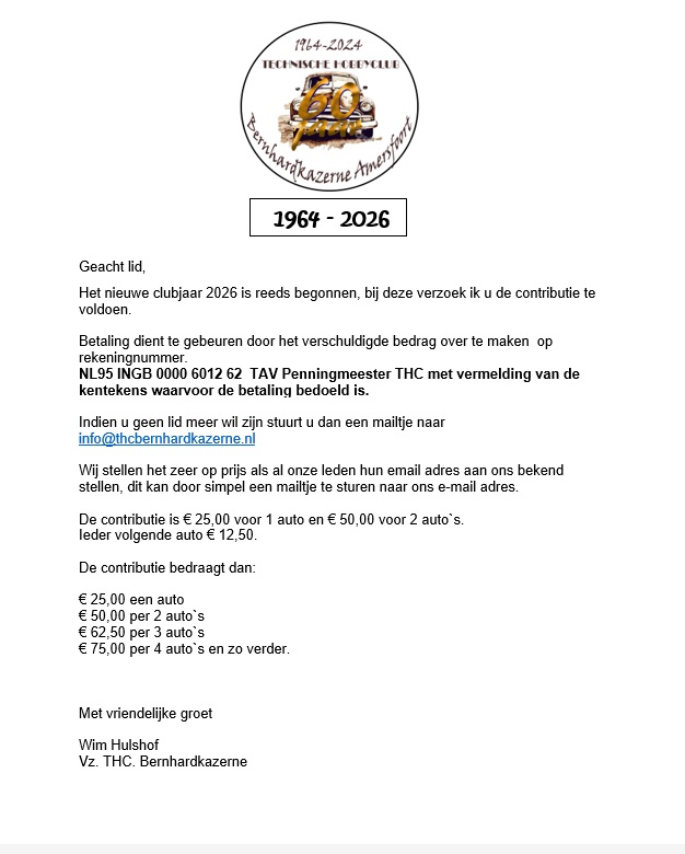 Stuur je mail/brief naar de voorzitter Wim Hulshof of kom eens langs voor een praatje. website: www.thcbernhardkazerne.nl